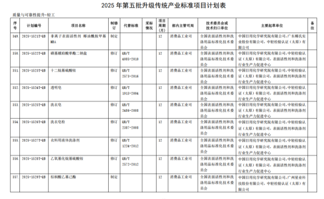 2025年12月29日,工业和信息化部发布2025年第五批行业标准制修订和外文版项目计划的通知,由全国表面活性剂和洗涤用品标准化技术委员会(TC 272)归口、申报立项的《非离子表面活性剂 椰油酰胺甲基MEA》等9项行业标准获批立项,标准项目周期12个月,标委会将按照工作计划组织标准的制定。具体项目见以下附表。